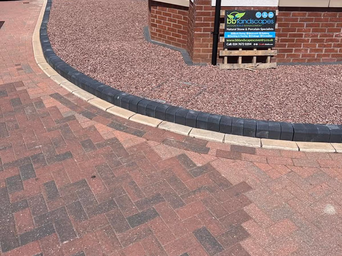 Camel natural stone slabs with standard charcoal paving. Charcoal KS Sub set retainers. Red terracotta gravel.