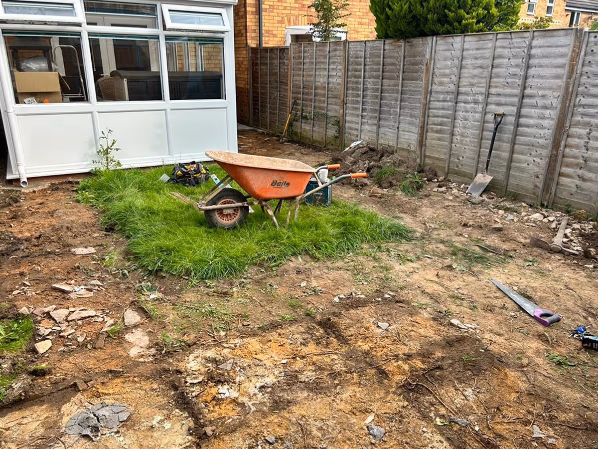 Kandla grey mixed-size porcelain patio with charcoal pencil edge paving. ACO drainage system. Rolawn Medallion turf