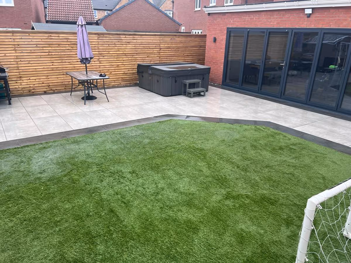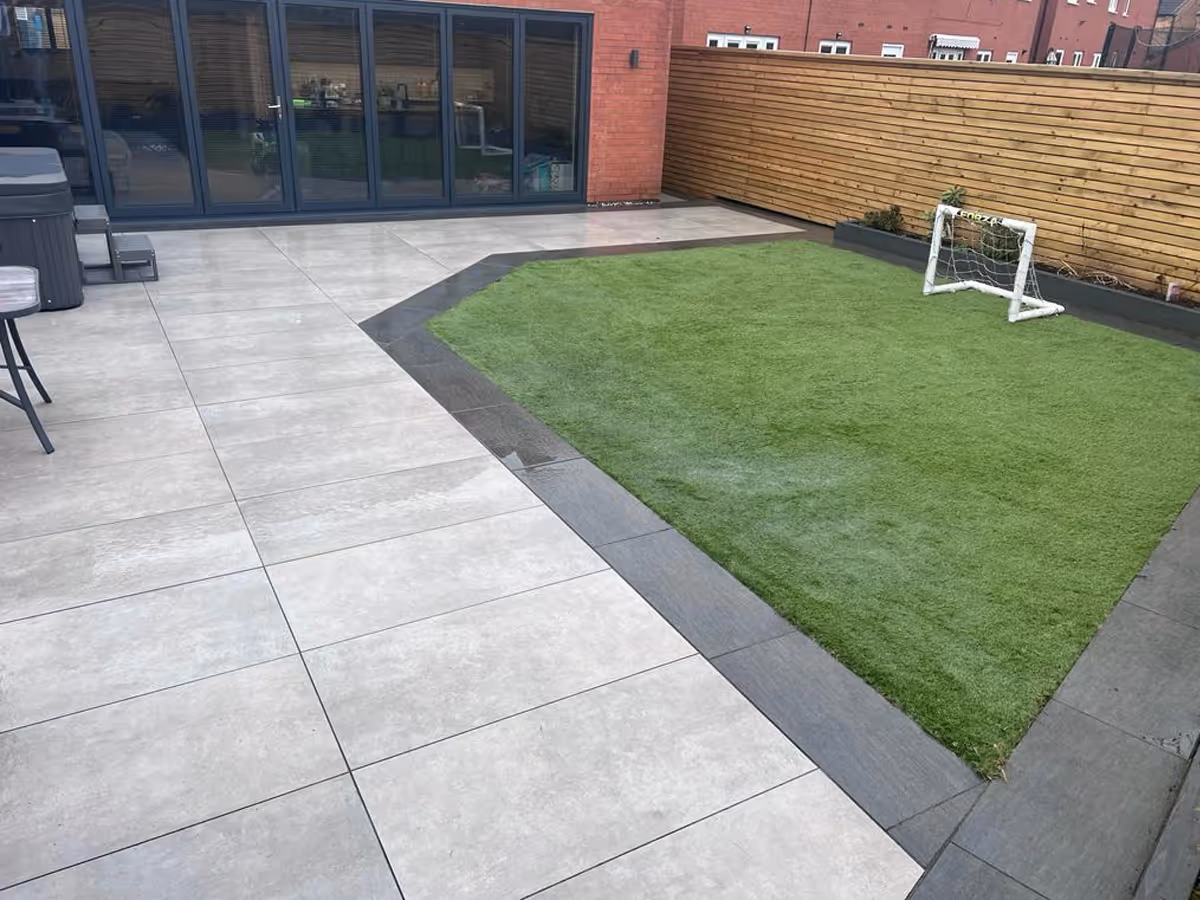 Evoque Greige porcelain Slabs with Grinito Anthracite edges. Sleeper beds. Artificial lawn. Venetian fencing with led strip light.