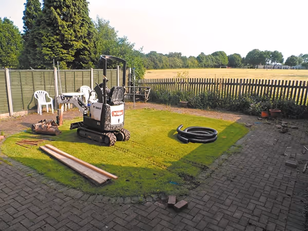 Mixed size autumn gold concrete patio with standard charcoal block border and new lawn