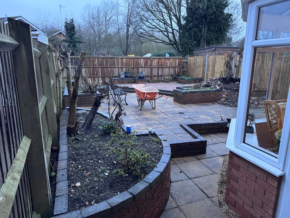 Mixed sized porcelain patio with gravel and charcoal pencil edge paving