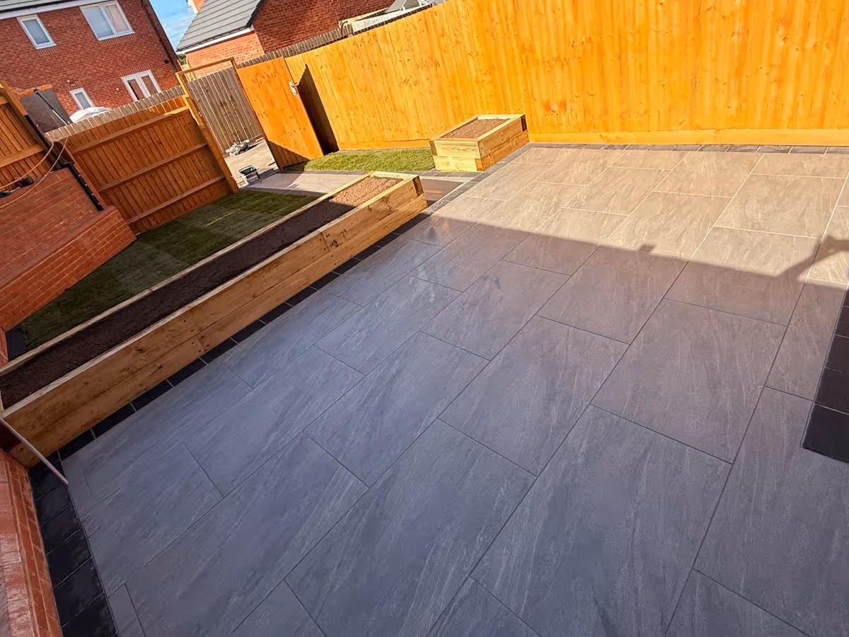 Mixed-size porcelain slabs with charcoal pencil edge paving, Sleeper beds and natural lawn