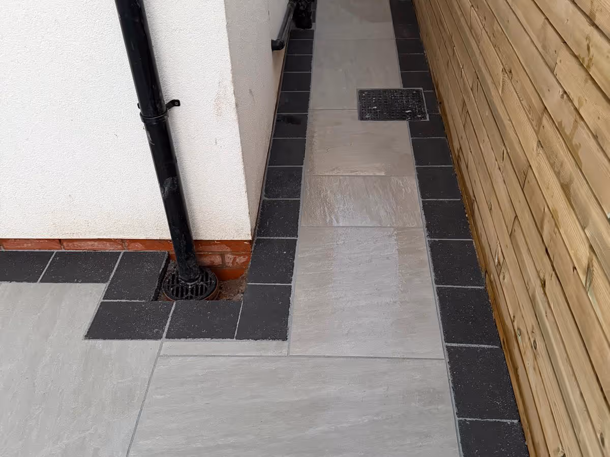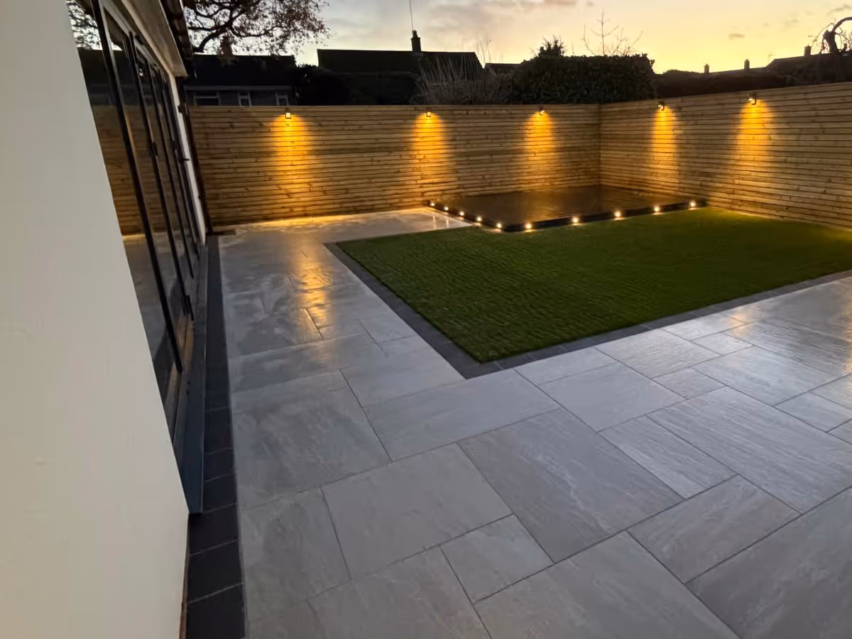 Mixed-size porcelain slabs with charcoal pencil edge paving. Composite decking, slatted wood fence and artificial turf.