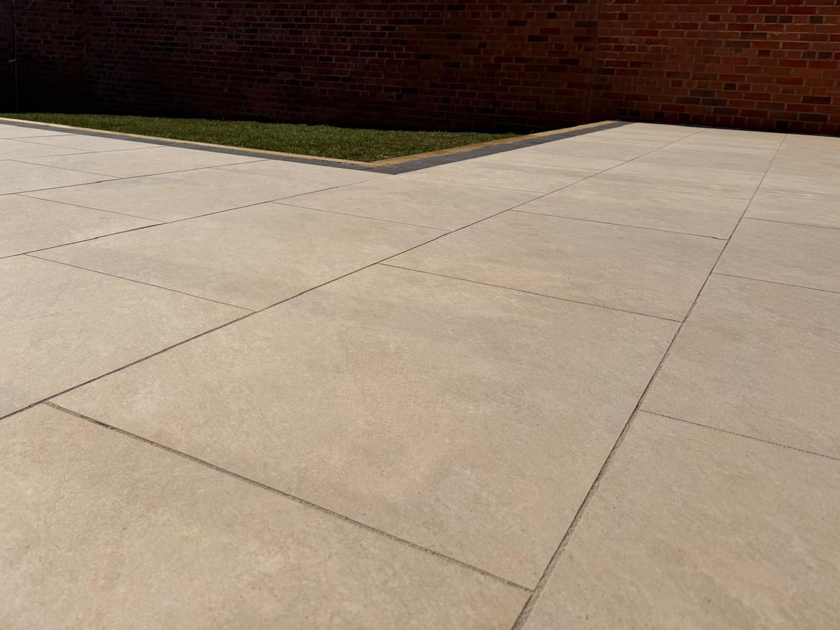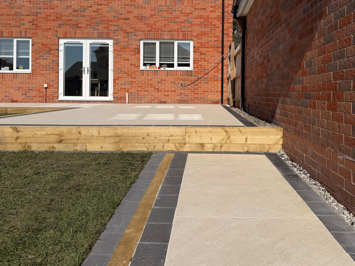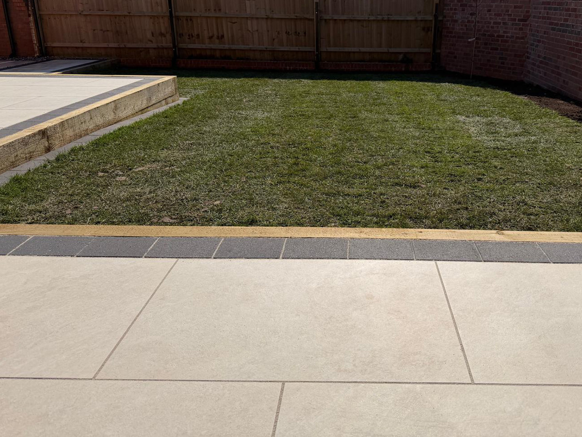 Cream porcelain patio with charcoal pencil edge paving and sleepers.