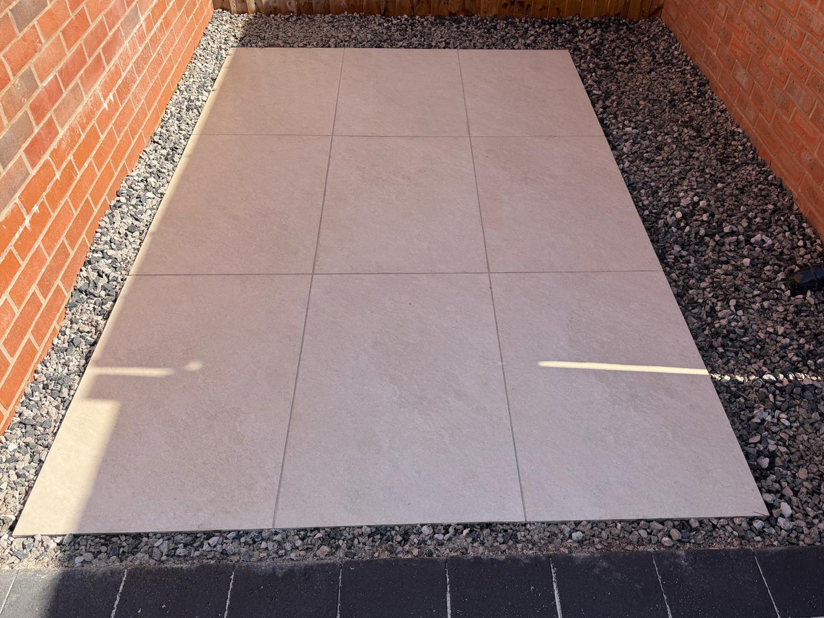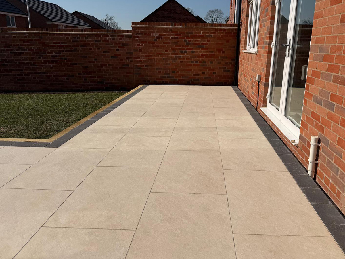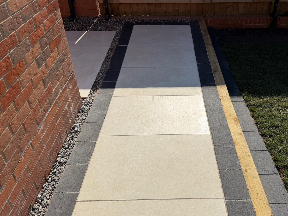 Cream porcelain patio with charcoal pencil edge paving and sleepers.