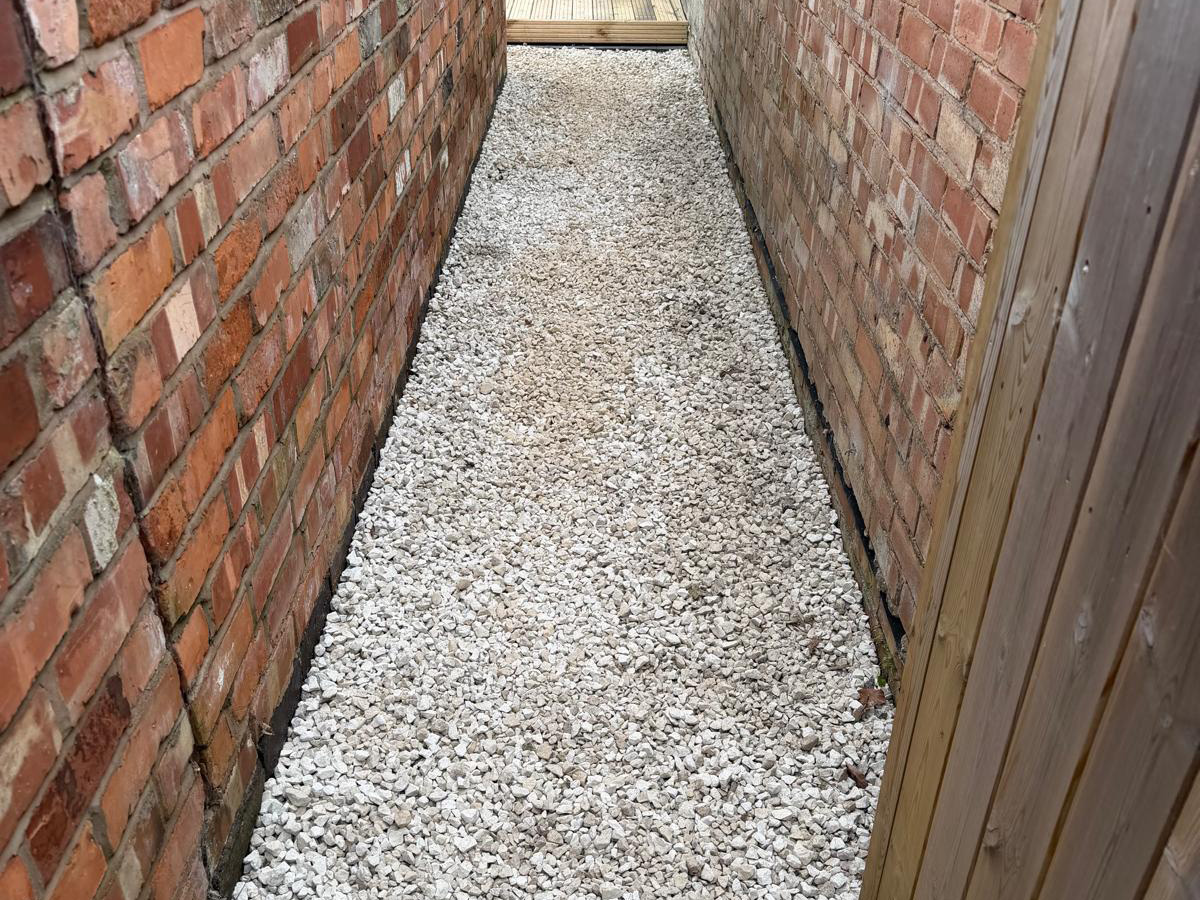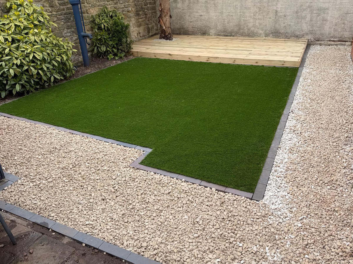 White gravel with charcoal pencil edge paving, decking and artificial turf.