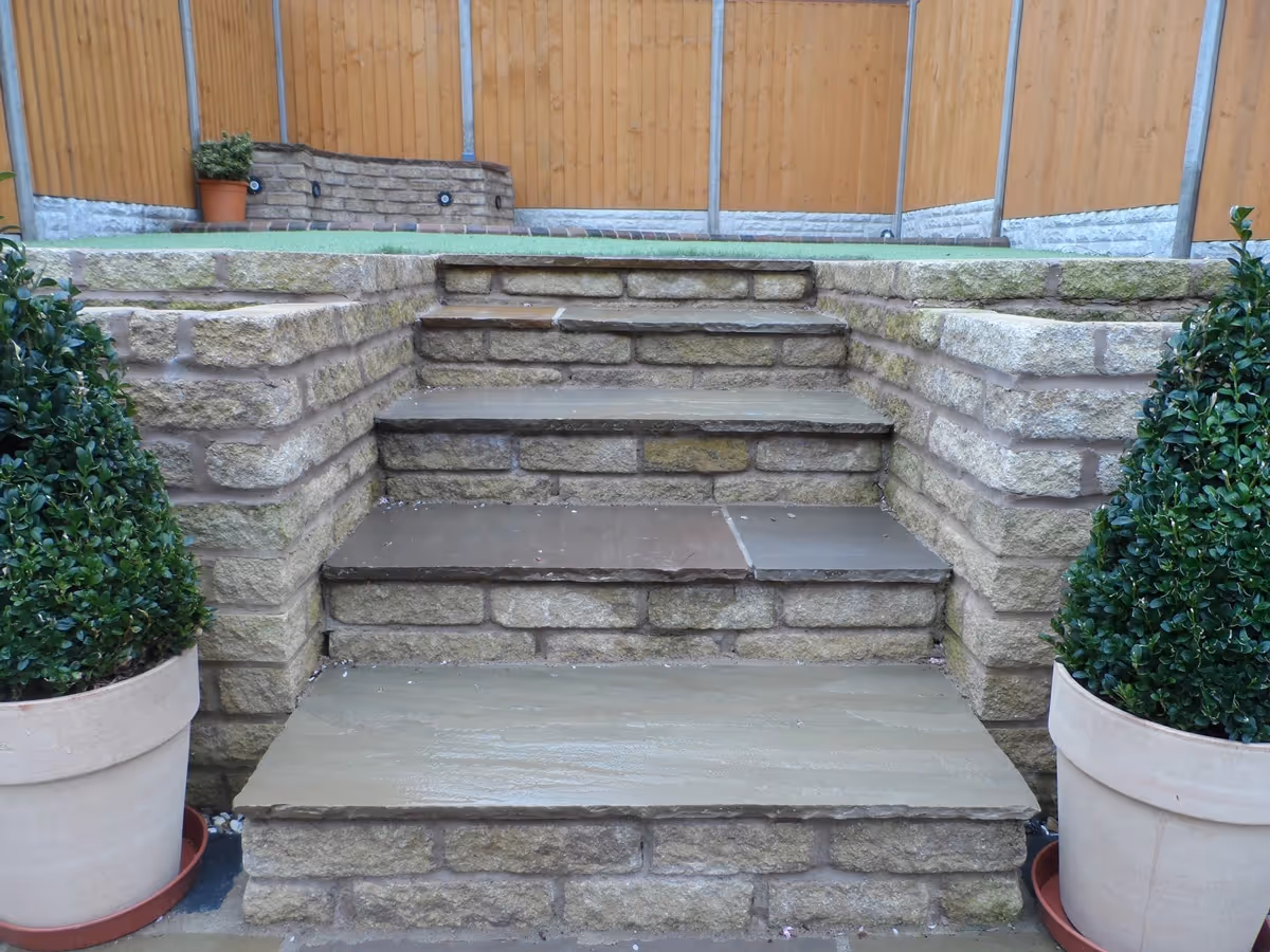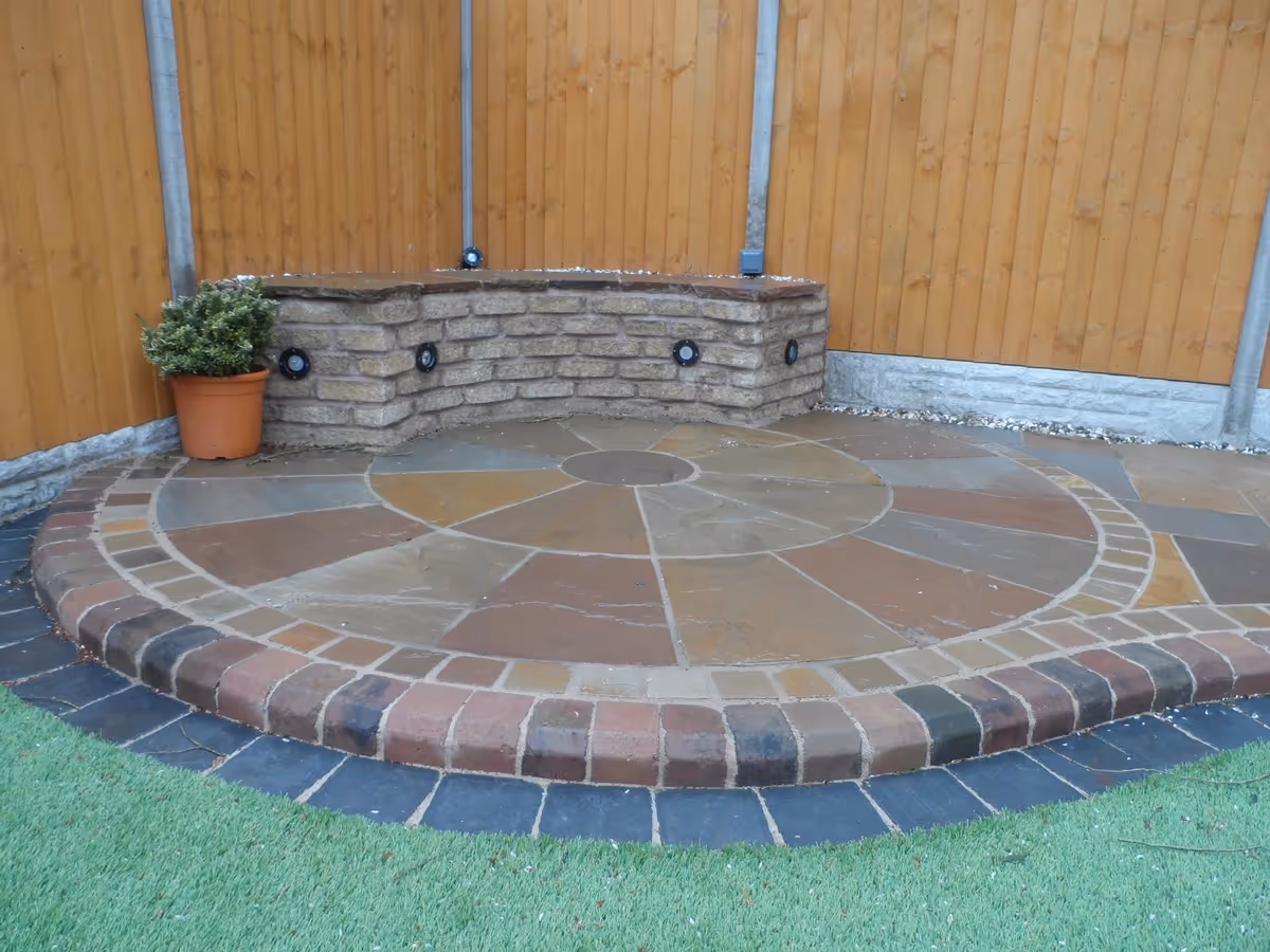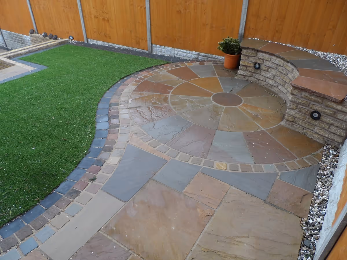 Mixed size camal natural stone patio with camal sets and large charcoal rumbled block, mellow York walling and steps and natural stone circle.