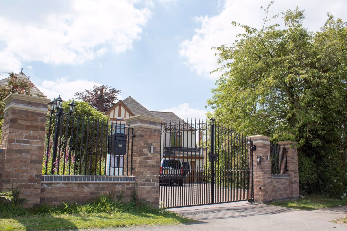 Brindle Rumbled paving set driveway with rustic brick wall and pillars.
