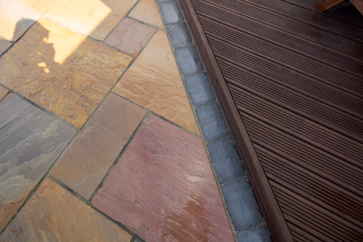 Mixed size camal natural stone patio with large charcoal rumbled block, raised sleeper area and artificial grass lawn.