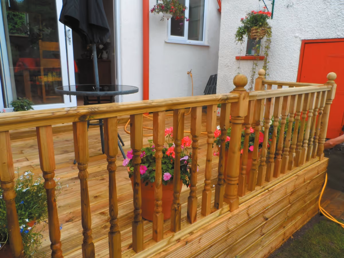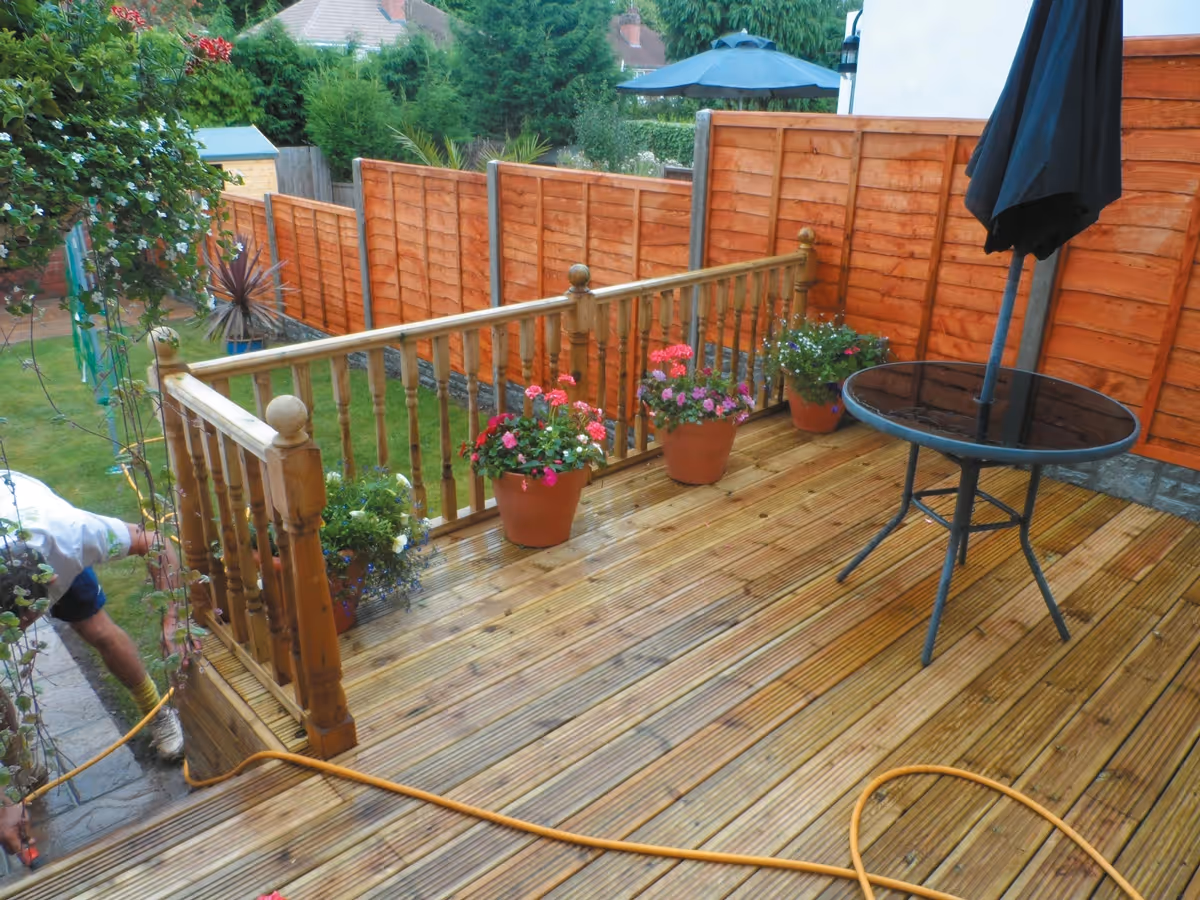 Mixed size autumn gold concrete patio, raised treated decking area and new lawn.