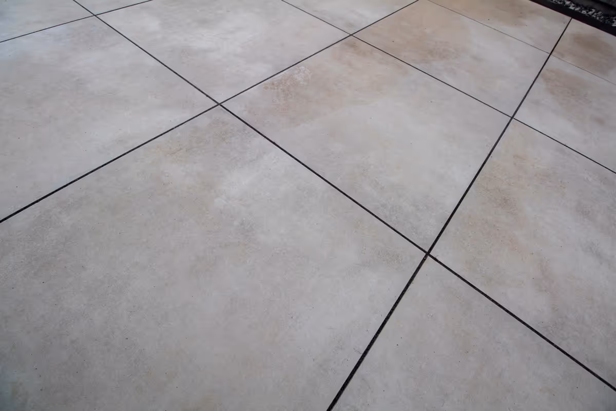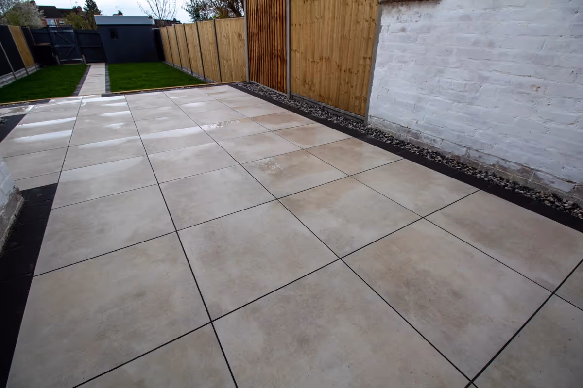 Town soft grey square porcelain slabs with charcoal pencil edge paving. Black Ice gravel. Sleeper retainers. Fence with concrete posts and gravel boards.