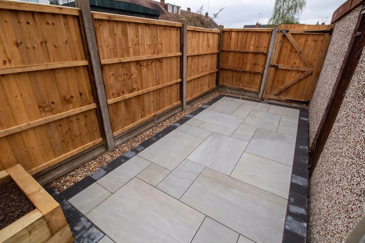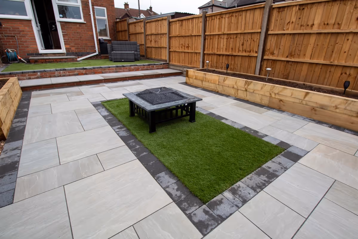 Kandla mixed-size porcelain patio with Charcoal pencil edge paving. Raised sleeper planters. Artificial Turf. New fence and gate